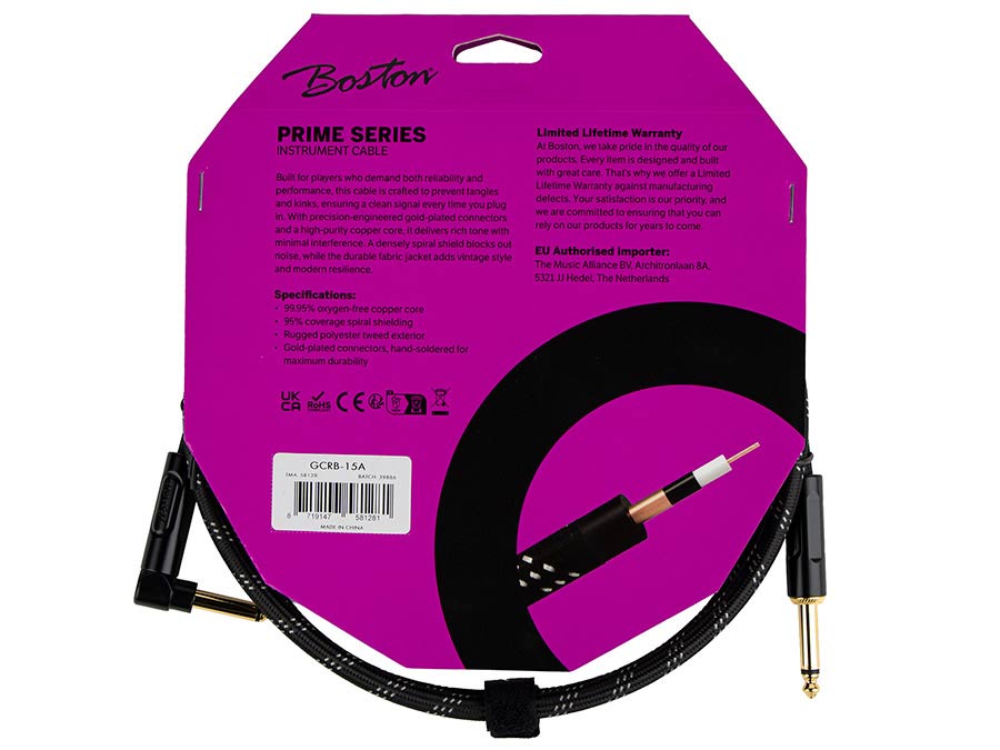 Boston GCRB-15A Prime Series Geweven Instrumentkabel Jack-Jack Haaks 1,5 Meter