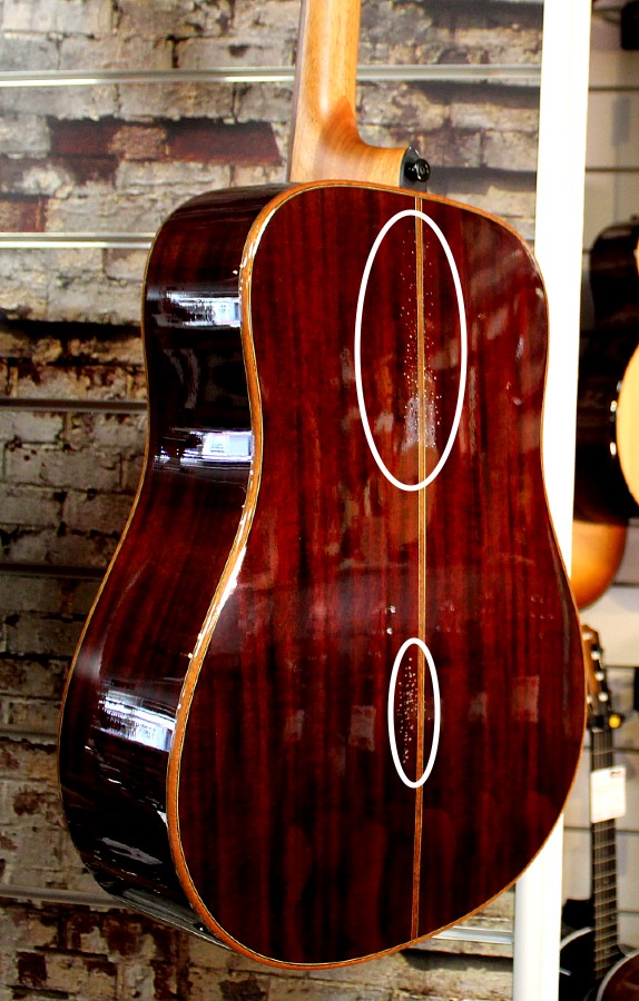 Deze mooie gitaar heeft aan de achterkant van de body blaasjes in het lak werk, te zien op de laatste foto!