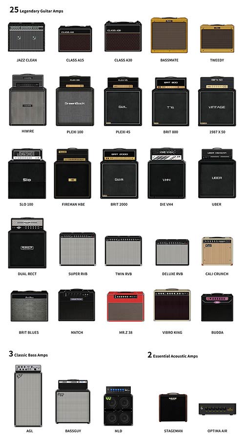 Knowing this, we focused on 30 classic essentials, and made each and every one live up to the standards of the most demanding players. Included in our top-shelf collection are: 25 electric guitar amp models, 2 acoustic amp models, 3 bass amp models.