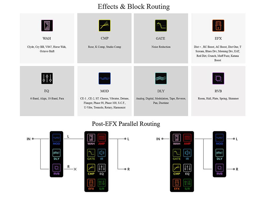 - 11 van volgorde wisselbare signaalblokken; post-FX kunnen ook parallel worden gebruikt